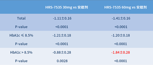 表1: 第16周,相较安慰剂,HRS-7535在不同基线水平下的HbA1c降幅