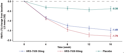 该研究主要验证新型口服小分子GLP-1RA HRS-7535在经二甲双胍和钠-葡萄糖共转运蛋白2抑制剂(SGLT2i)治疗后血糖控制仍欠佳的中国2型糖尿病(T2DM)患者的疗效与安全性,研究取得重要突破[1]:HRS-7535 60mg组可进一步降低糖化血红蛋白(HbA1c)达1.8%,同时安全性良好。该研究有望为此类患者提供新的联合治疗选择。